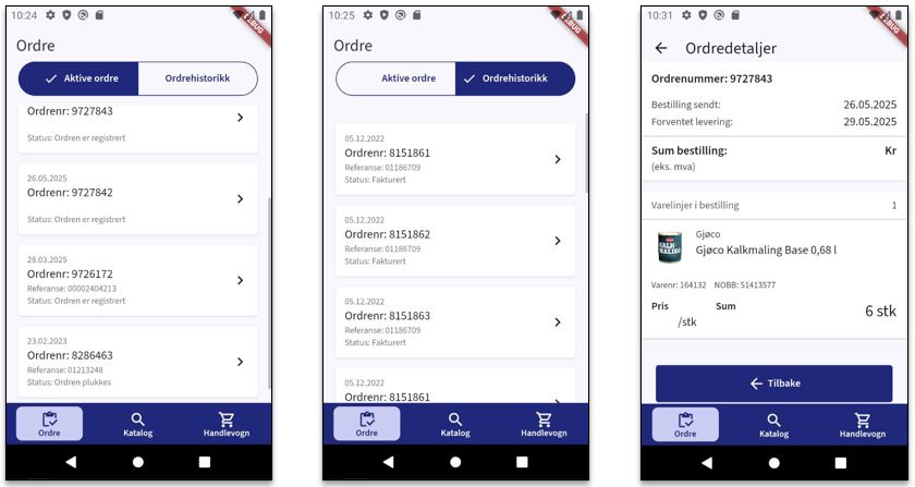 Nede i venstre hjørne i appen finner du knappen "Ordre". Ved å trykke på denne kommer du til aktive ordre og ordrehistorikken din. Alle ordre er merket med dato, ordrenummer, referanse og status. Ved å gå inn på ordrene får du detaljer.
