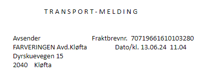 - Dere mottar en transportmelding på e-post. Denne inneholder et fraktbrevnummer, og dette kan spores hos vår transportør JK Transport www.jktransport.no. Legg inn fraktbrevnummeret i søkefeltet å trykk søk. Se eksempel under: